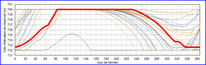 Notre utilitaire de calcul à cet effet évalue ensuite le productible multi-annuel en puissance et en énergie de la centrale en considérant des pas de simulations de 1 h. Pour chacune de ces heures, sont calculés les apports d’eau, l’évaporation, la demande selon le profil de charge considéré et les débits turbinés requis pour répondre à cette demande selon la hauteur de chute à ce moment. Le bilan horaire des eaux reçus et restituées permet alors d’établir la cote du réservoir à l’heure suivante. Le productible annuel de base est évalué en considérant un taux de déficit de production déterminé à ne pas excéder.