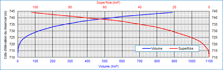 À l’aide de données topographiques, 3E Ing. évalue les courbes hauteur-superficie-volume du réservoir.